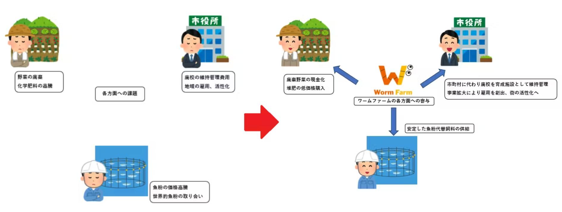水産養殖業でのワームの可能性を知り、「海と大地をワームでつなぐことができるのではないか」というアイデアが生まれました。